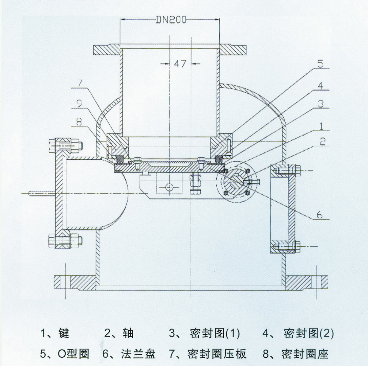 進(jìn)料閥設(shè)置于發(fā)送器頂部,用于發(fā)送器的進(jìn)料進(jìn)行控制。其工作原理是由外部氣缸帶動軸作900回轉(zhuǎn)從而帶動法蘭盤,當(dāng)法蘭盤向上時,即關(guān)閉進(jìn)料閥。密封是依靠固定在閥體上密封圈(1)和固定在法蘭盤封圈(2)的緊密接觸為實現(xiàn)的。
